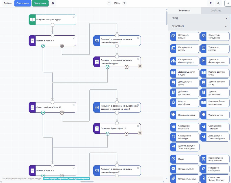 Все это даст Вам возможность создания воронок продаж практически любой сложности, начиная от простой последовательности автоматических сообщений в ВК и Телеграм, заканчивая создание чат-ботов реагирующих на действия подписчиков.