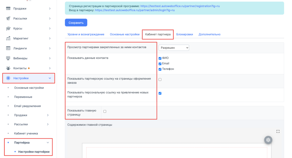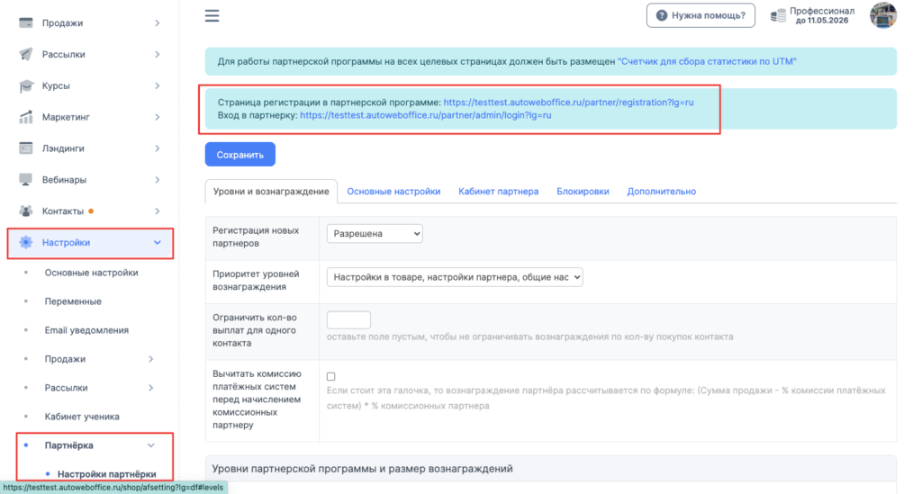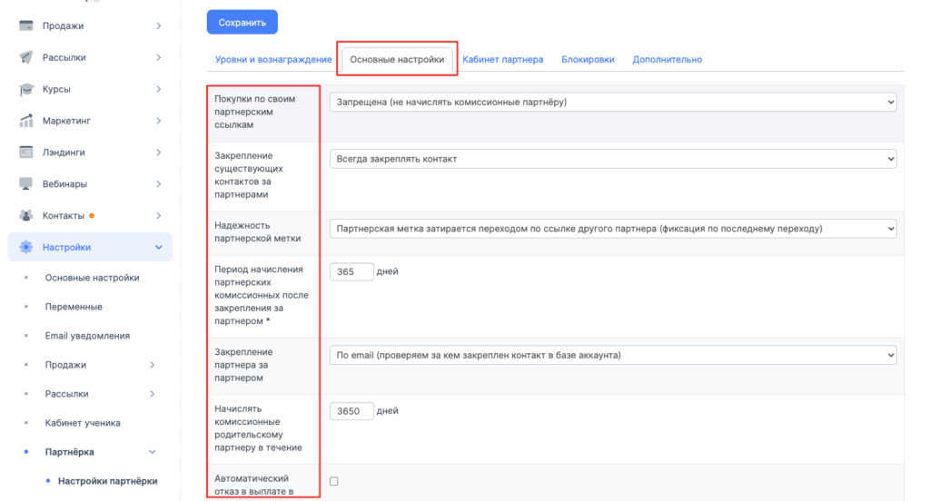Зайдите в Автовебофис → Настройки → Партнёрка → Настройки партнёрской программы.
