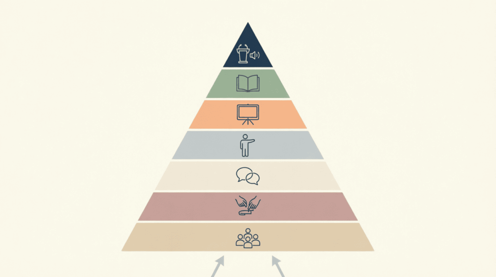 Модели обучения: Пирамида обучения (Дейл). Чем больше практики и вовлечения — тем лучше усвоение