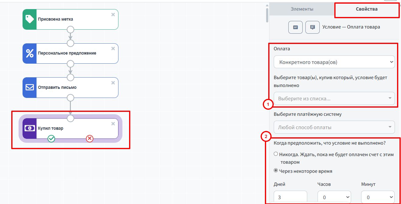 Входом в процесс является элемент «Присвоена метка». За ним следует действие «Персональное предложение», действие «Отправить письмо» и условие проверки покупки «Купил товар». Элементы следует соединять между собой. Бизнес-процесс рекомендуется периодически сохранять.